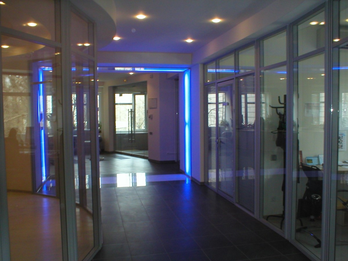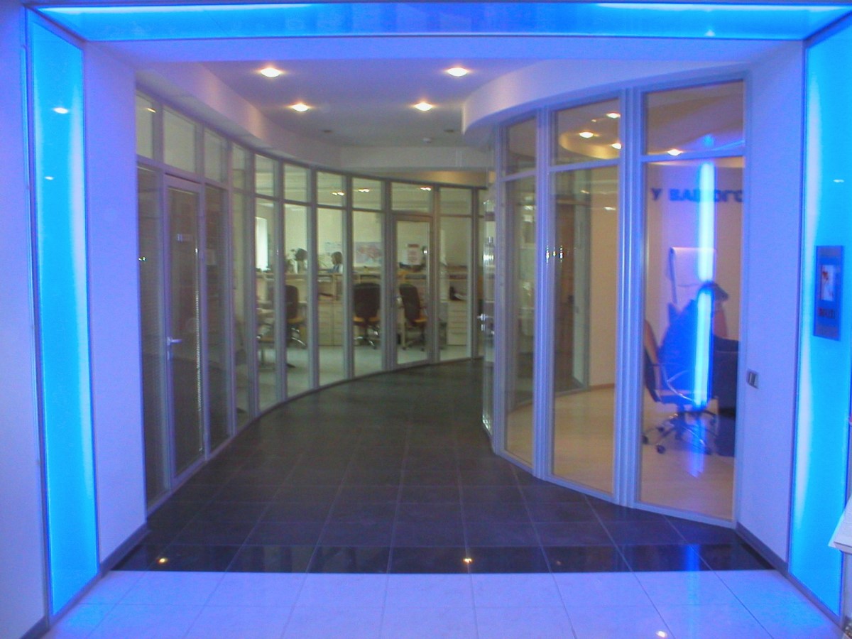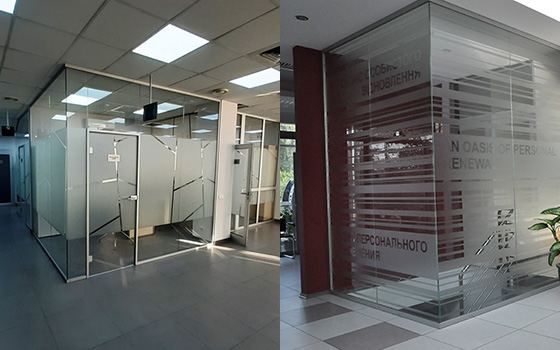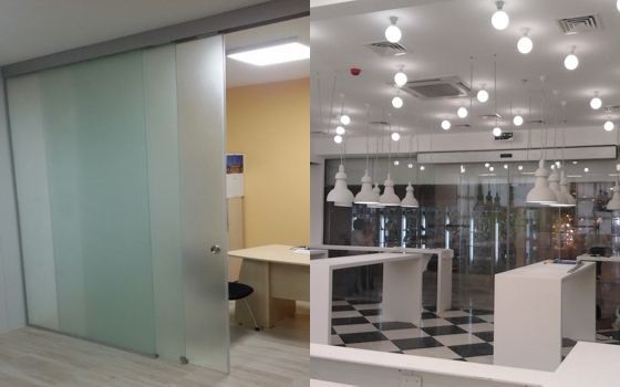 Суцільноскляні перегородки — це прозора стіна із гартованого скла (зазвичай товщиною 8,10,12 мм), вертикальні шви з’єднані прозорою стрічкою. В результаті Ви отримуєте мінімальну кількість профілю та максимальну площу безпечного скла. Опції: орні, маятникові, розсувні або інтер'єрні двері, тонування скла, фарбування профілю на ваш смак, великий вибір фурнітури.