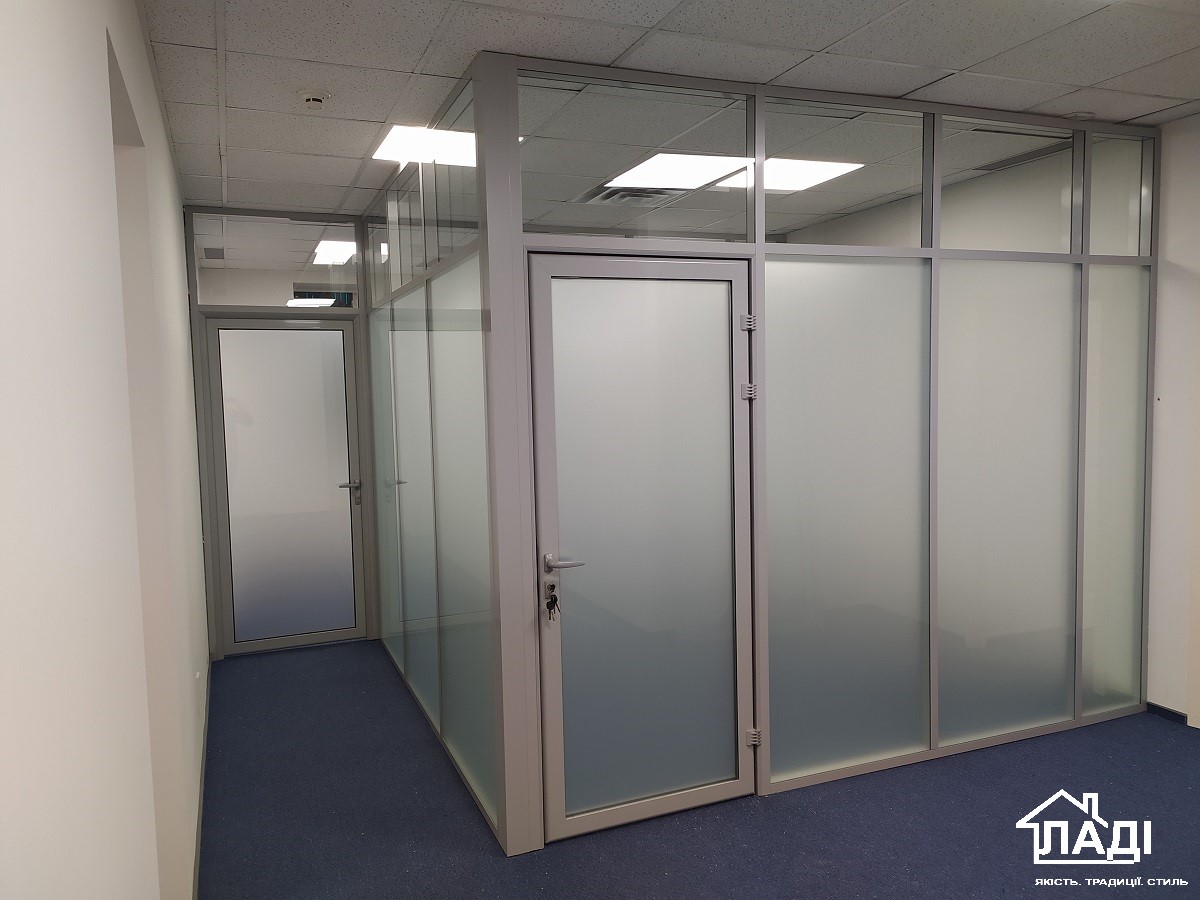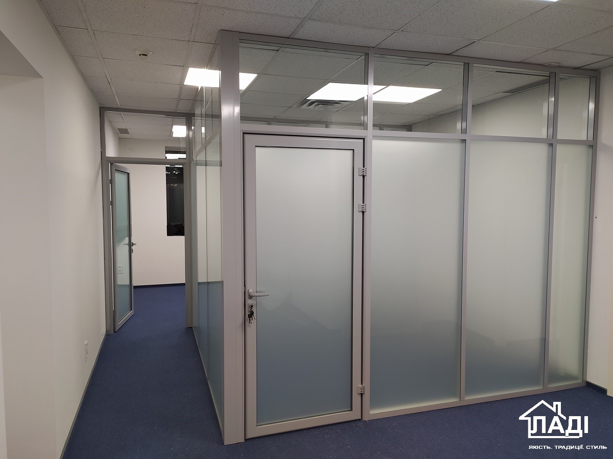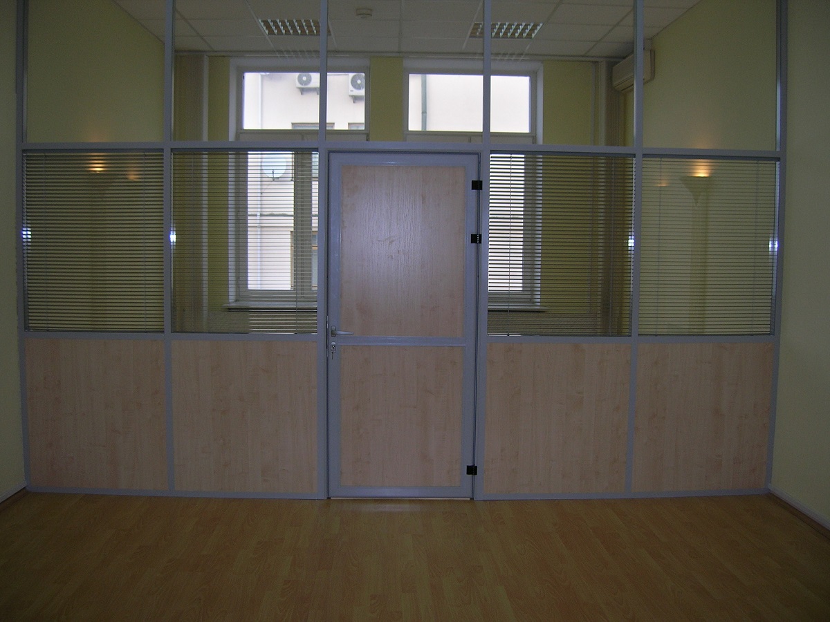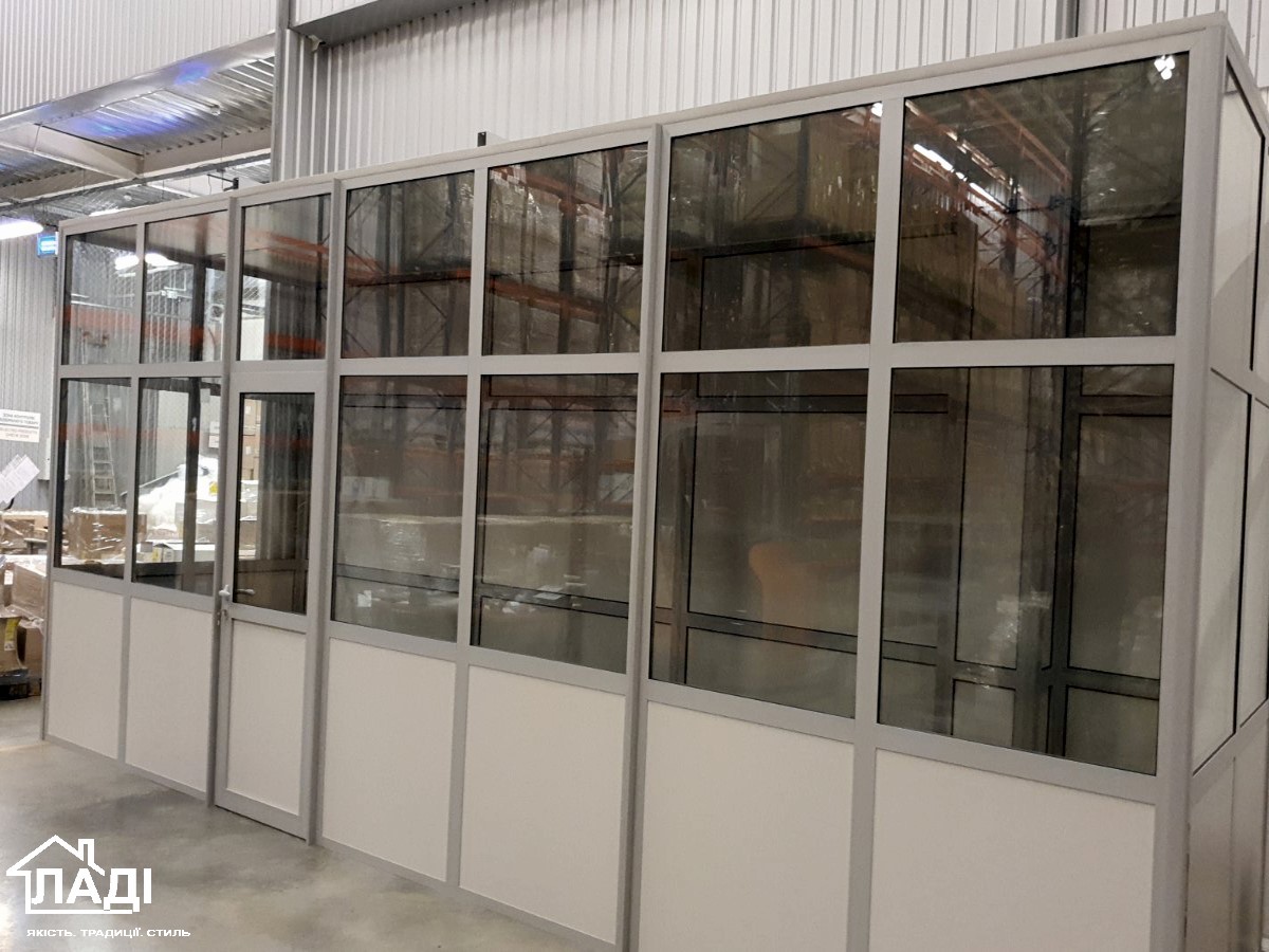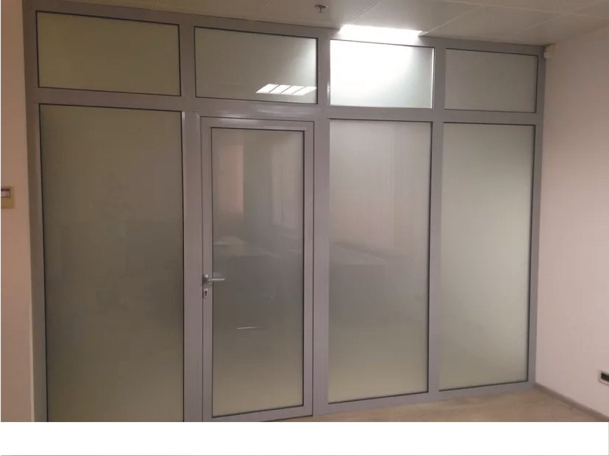 Алюмінієві перегородки здатні до пересування, реконструкції, мобільні і прості у монтажі. Установка не вимагає зупинки життєдіяльності всередині приміщення, що реконструюється. Опції: скло 4-5 мм, ламіноване ДСП, керовані жалюзі, наклеювання захисної плівки, тонування скла, фарбування профілю на ваш смак.