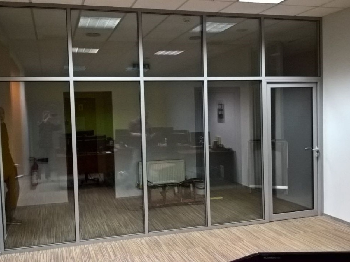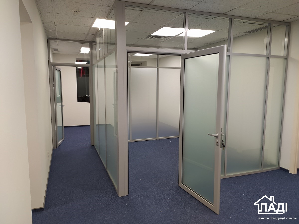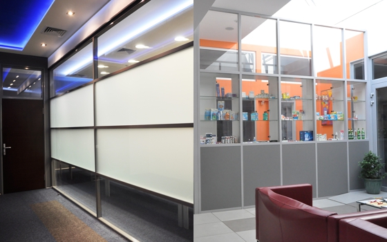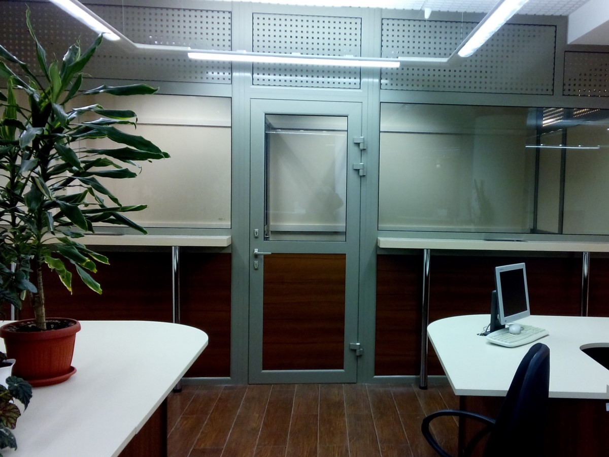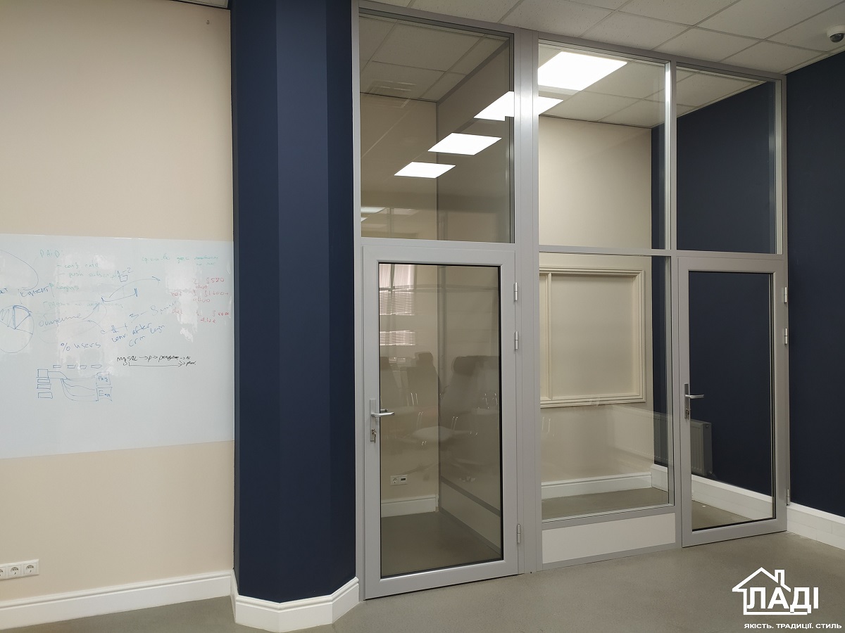 Алюмінієві перегородки здатні до пересування, реконструкції, мобільні і прості у монтажі. Установка не вимагає зупинки життєдіяльності всередині приміщення, що реконструюється. Опції: скло 4-5 мм, ламіноване ДСП, керовані жалюзі, наклеювання захисної плівки, тонування скла, фарбування профілю на ваш смак.