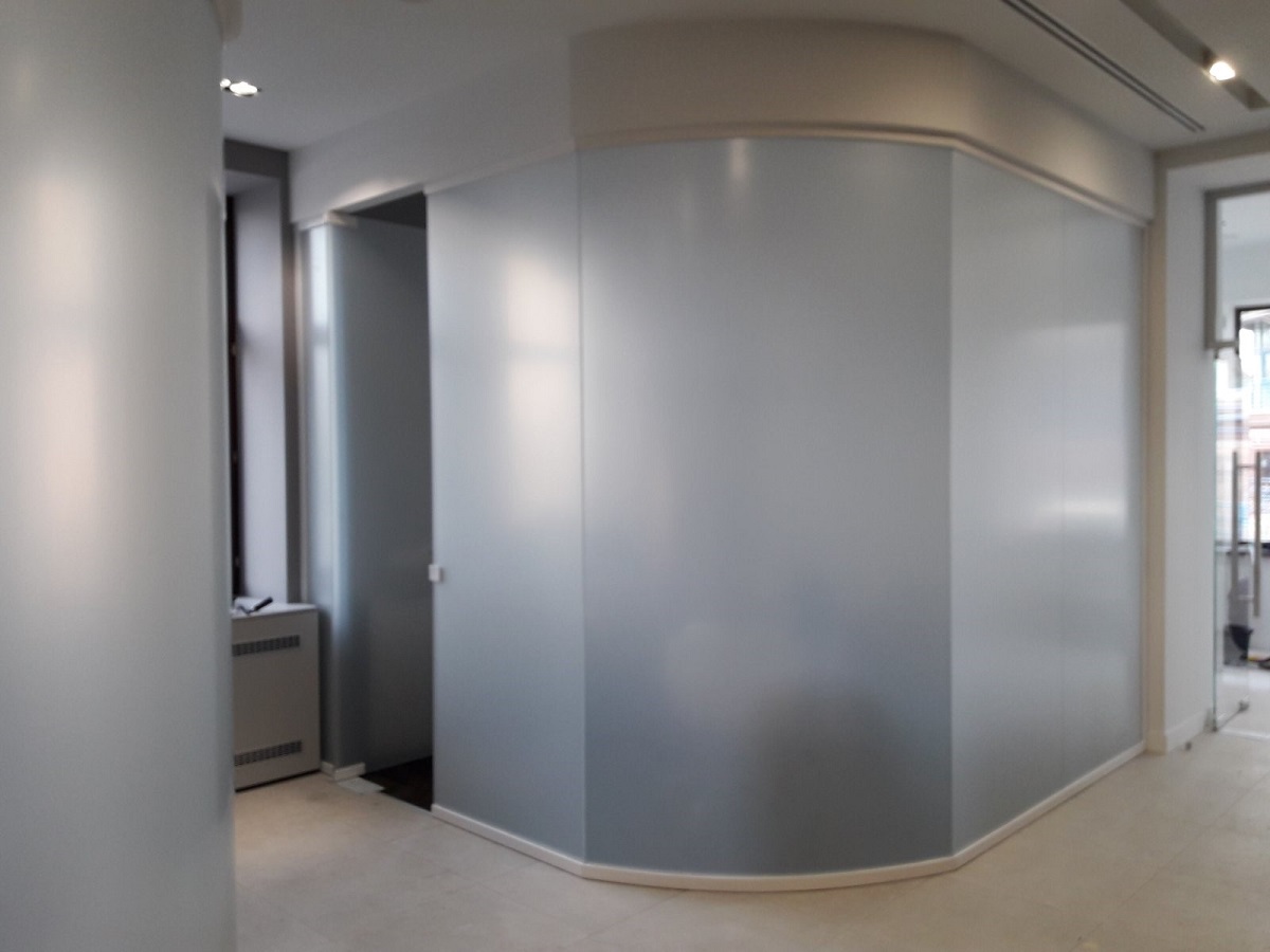 Прозорі суцільноскляні перегородки — це максимальна відкритість зі збереженням конфіденційності. Виконують завдання зонування, при цьому вони «розчиняються» в просторі, не зменшуючи та не обтяжуючи його. Суцільна прозора стіна із гартованого скла (зазвичай товщиною 8,10,12 мм), вертикальні шви з’єднані прозорою стрічкою, для досягнення кращої шумоізоляції (до 42db) можливе виконання з подвійного скла.