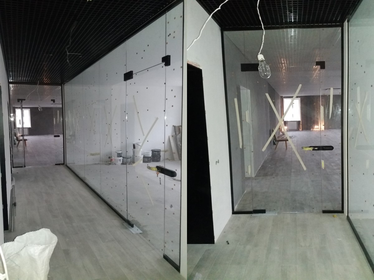 Суцільноскляні перегородки — це прозора стіна із гартованого скла (зазвичай товщиною 8,10,12 мм), вертикальні шви з’єднані прозорою стрічкою. В результаті Ви отримуєте мінімальну кількість профілю та максимальну площу безпечного скла. Опції: орні, маятникові, розсувні або інтер'єрні двері, тонування скла, фарбування профілю на ваш смак, великий вибір фурнітури.