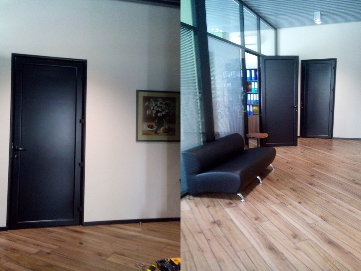 Виготовлення алюмінієвих дверей передбачає два основні типи. Конструкція «холодного профілю» застосовується в дверних отворах, розташованих усередині приміщень. Конструкція «теплого профілю» з термоізолючими вставками застосовується в дверних отворах, що виходять на вулицю. Опції: орні, маятникові, розсувні, заповнення скло 10-12 мм, фарбування профілю на ваш смак, великий вибір фурнітури.